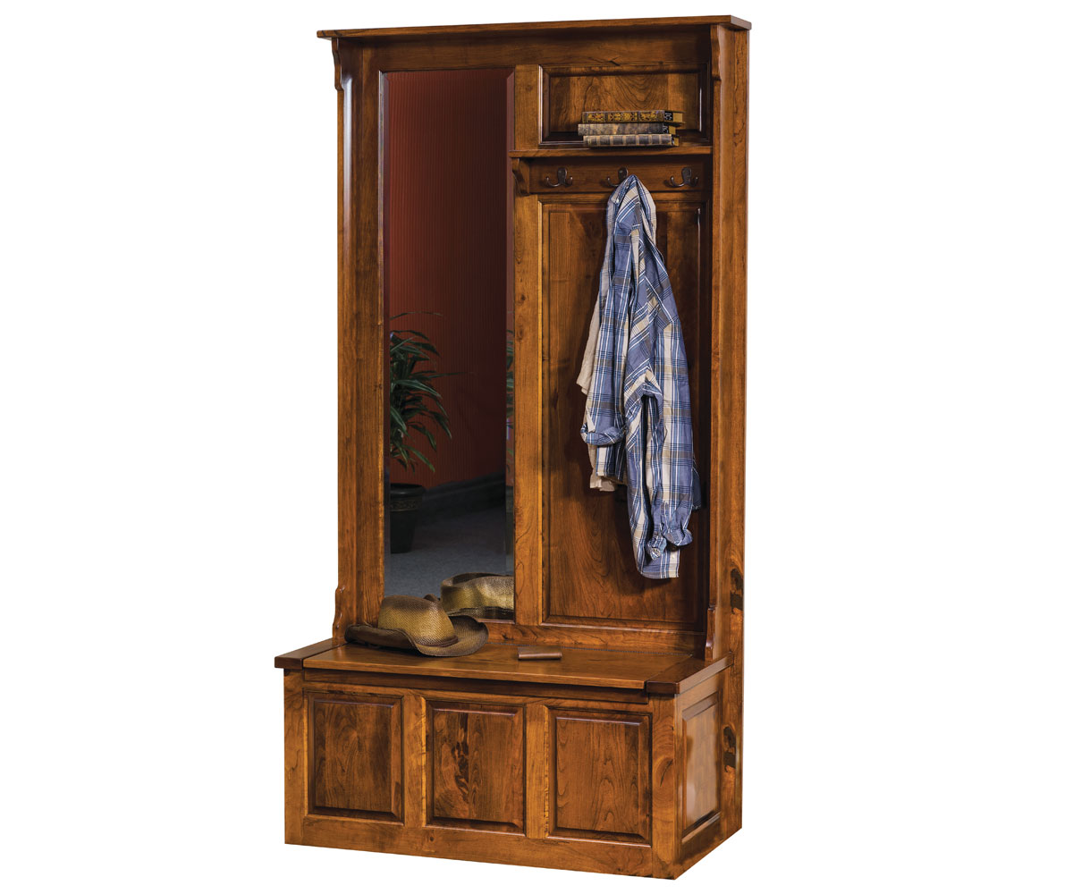 Dimensions: 42″W x 19″D x 78″H Shown With: Wood: Rustic Cherry Stain: FC-N3173 New Carrington Hardware: P27115-BL Features: • Beveled Mirror: 15″W x 55″H • Lid lifts for storage • Soft close hinge on the lid Item Code: AJW213