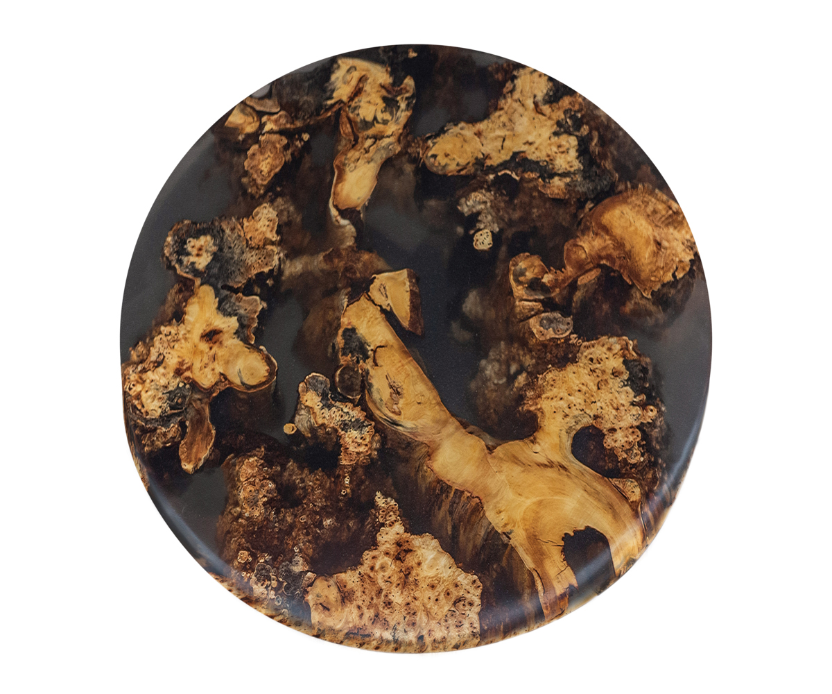Dimensions: 52″Round Shown With: Wood: Buckeye Burl Epoxy: Black Base: Impression Base Color: Flat Black Features: • Dimensions will vary slightly due to live edge • Each table has its own unique look due to the wood patterns • Can be customized with other epoxy colors