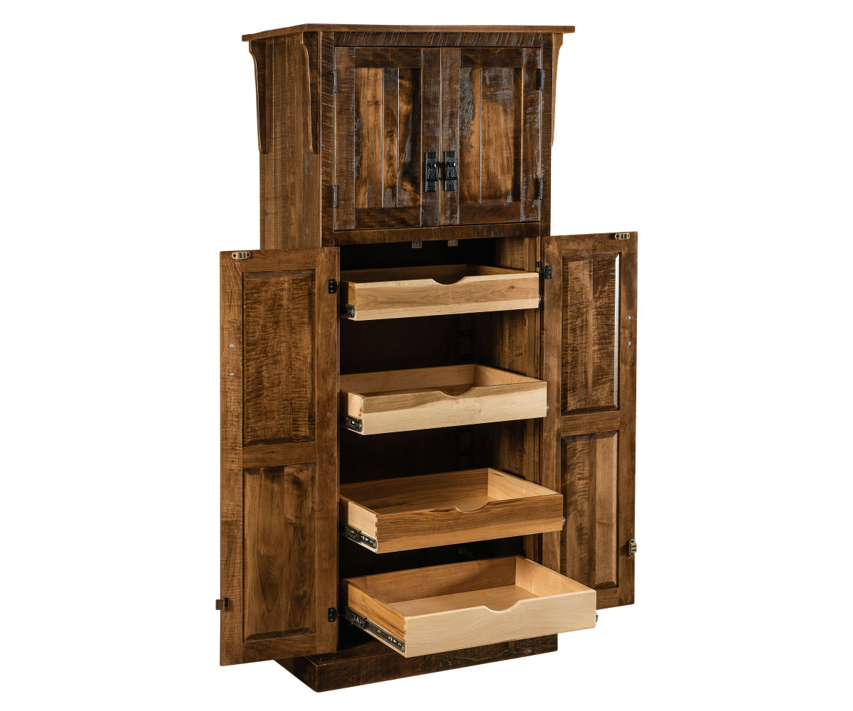 Dimensions: 20″ D x 32″ W x 72″ H Item Code: KDMP108 Features: 4 Doors 1 Adj. Shelf, 4 Adj. Roll-out Shelves Shown in: Rough Sawn Almond Also Available: KDMP107 4 Adj. Shelves
