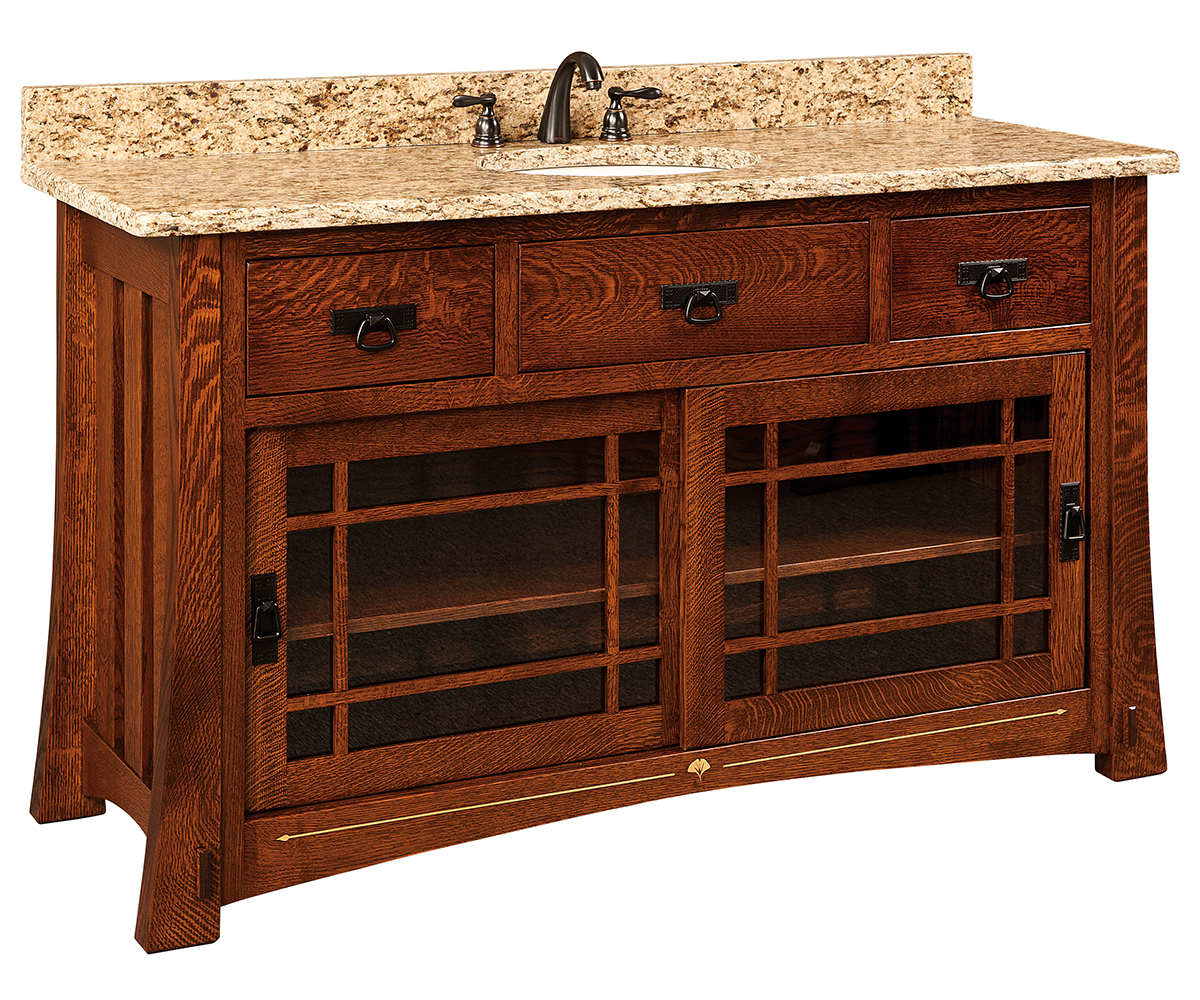 Overall Dimensions: 60″W x 22″D x 36″H Shown With: Wood: Quarter Sawn White Oak Stain : FC 10901 Golden Brown Hardware: 34 Countertop: Juperano Gold Dark Granite Features: • False front on center drawer • Dovetailed drawers on each side • Premium soft close undermount drawer slides • Drawer dimensions: 18¾”D x 6″H • Clear glass in sliding doors • Solid wood natural yellow inlay detail • Dimensions listed are with top Options: • Top needs to be purchased separately Item Code: MGLV60NT