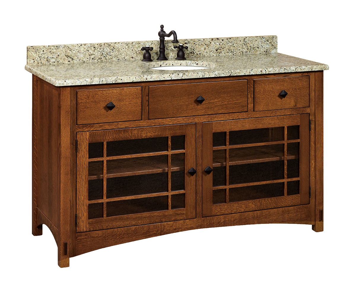 Overall Dimensions: 60″W x 22″D x 36″H Shown With: Wood: Quarter Sawn White Oak Stain: Michael’s Cherry Hardware: 3 Countertop: Juperano Gold Dark Granite Features: • False front center • Dovetailed side drawers • Premium soft close undermount drawer slides • Clear glass doors • Dimensions listed are with top Options: • Top needs to be purchased separately Item Code: SHCLV60NT